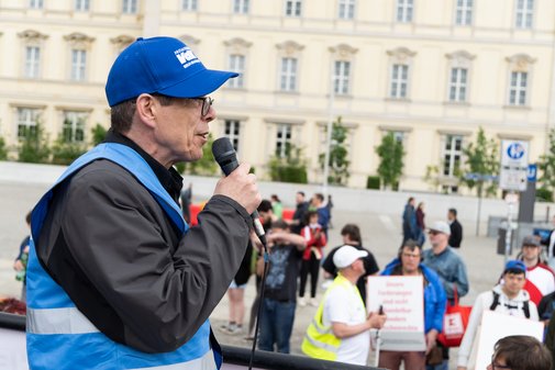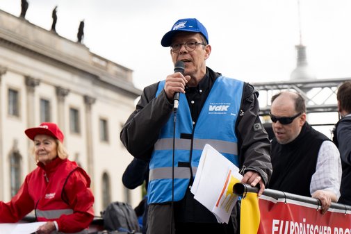 Gemeinsam mit der Landesvorsitzenden des SoVDkurz fürSozialverband Deutschland, Ursula Engelen-Kefer, eröffnete Rainer Oetting, Geschäftsführer des VdK Berlin-Brandenburg, den Protestzug. Beide mahnten in ihren Forderungen vor allem die Themen an, bei denen Deutschland noch dringenden Nachholbedarf hat. Engelen-Kefer machte in ihrer Rede auf die erschreckende Zunahme von Gewalt gegen Frauen im eigenen häuslichen Umfeld und auch öffentlichen Einrichtungen aufmerksam: „Wir verlangen von der Politik den Ausbau von Frauenhäusern mit Barrierefreiheit für Frauen und deren Kinder. Hierfür müssen die finanziellen Mittel in den öffentlichen Haushalten aufgestockt werden. Allen Vorhaben für die Beteiligung der betroffenen Mädchen und Frauen an den Kosten in Schutzeinrichtungen ist eine strikte Absage zu erteilen“.